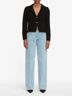 This denim bomber features a plush, 100% shearling collar. The body is crafted from sustainable, non-stretch denim and finished with oversized front patch pockets.